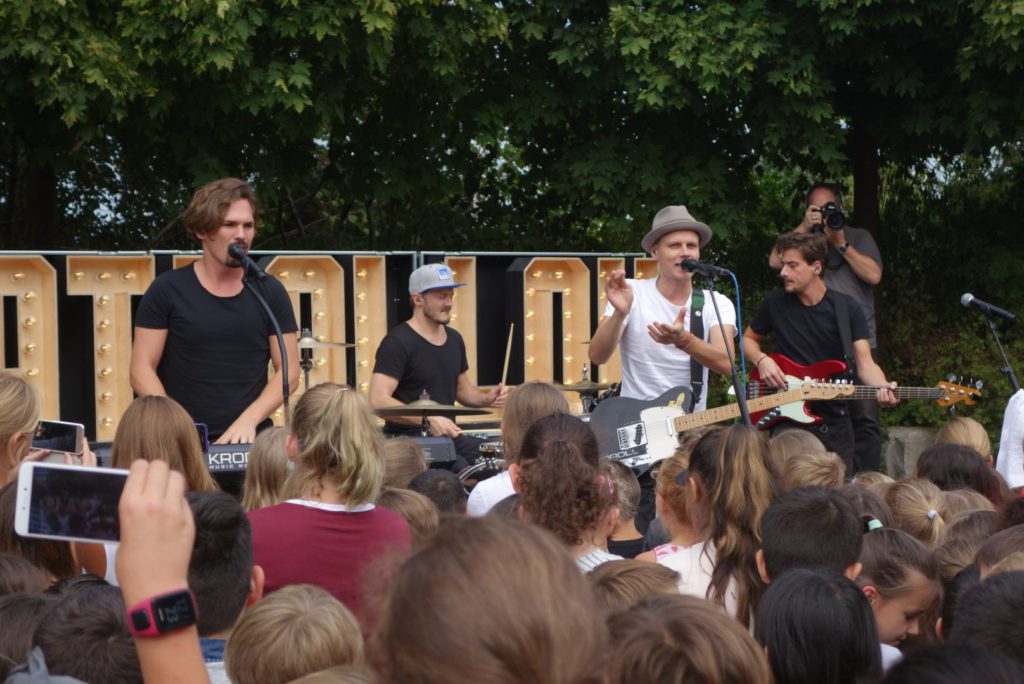 „Das ist krass … voll krass…“, staunte ein Drittklässler am Mittwoch als die große Bühne auf dem Lützenkirchener Schulhof aufgebaut wurde und die Spannung stieg bis ENDLICH die vier Musiker der Kölner Band die Bühne betraten. Mit selbstbemalten Cat Ballou T-Shirts und liebevoll gestalteten Plakaten begrüßten sie herzlich die Band. Beim ersten Lied waren die Kirchfeld-Kinder von allem noch sehr beeindruckt. Aber schnell gelang es den Musikern und dem Duda-Maskottchen das Publikum zum hüpfen, tanzen, schunkeln und mitsingen zu animieren.