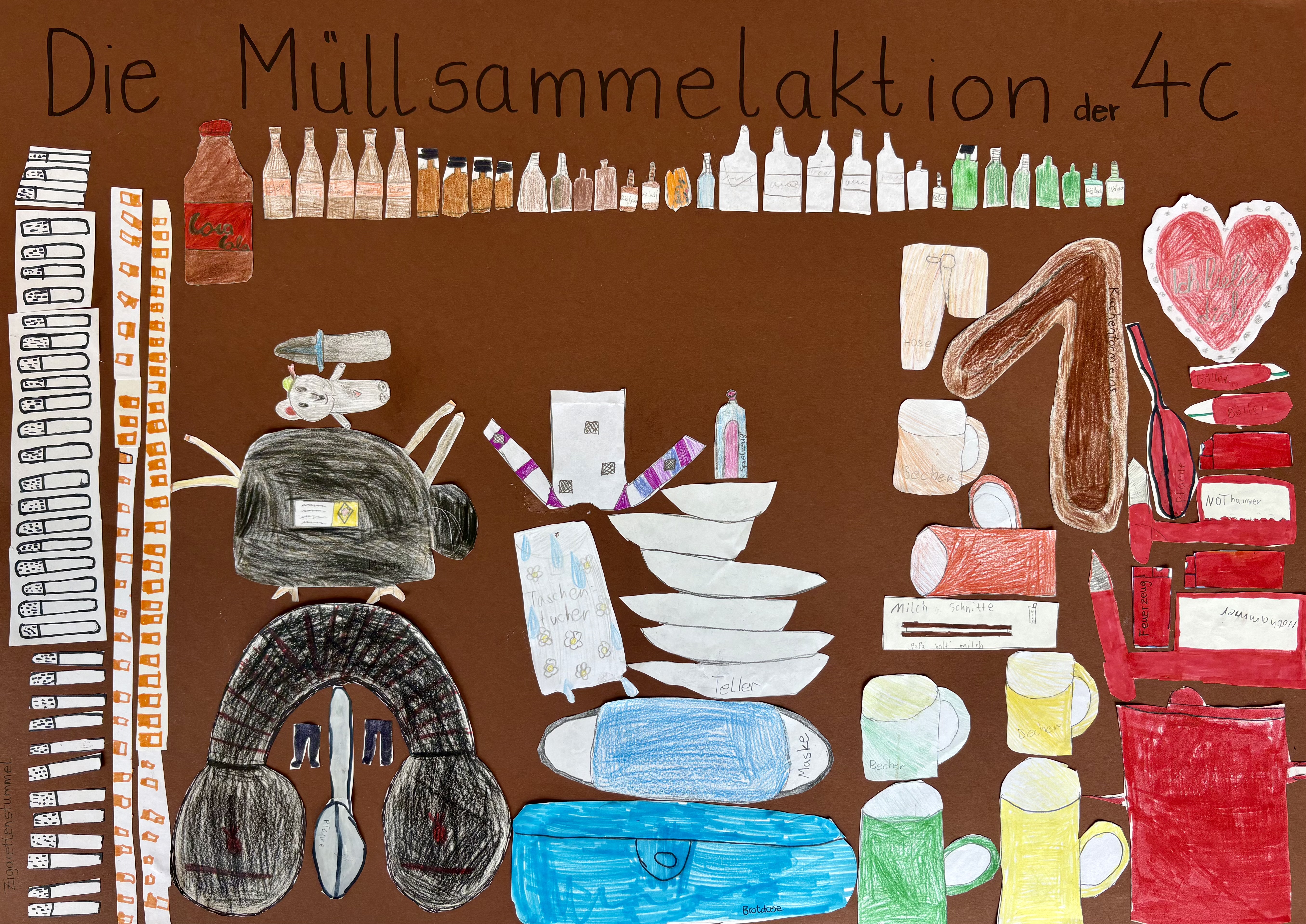 Ein Schüler berichtet: Alle Klassen der GGS Im Kirchfeld haben sich an einem Tag auf Müllsuche gemacht. Eine Klasse hatte eine besondere Idee und sammelte alle 4 Tage. Viola, Maja und Leon schreiben: „Viele Sonnenkinder der Klasse 4b haben erfolgreich auf ihren Schulwegen Müll gesammelt. Vier Tage lang wurde viel Müll in die Klasse geschleppt, zum Beispiel ein Wahlplakat, eine Transportbox für Tiere, Teile vom Fahrrad und anderes mehr. Oje!“