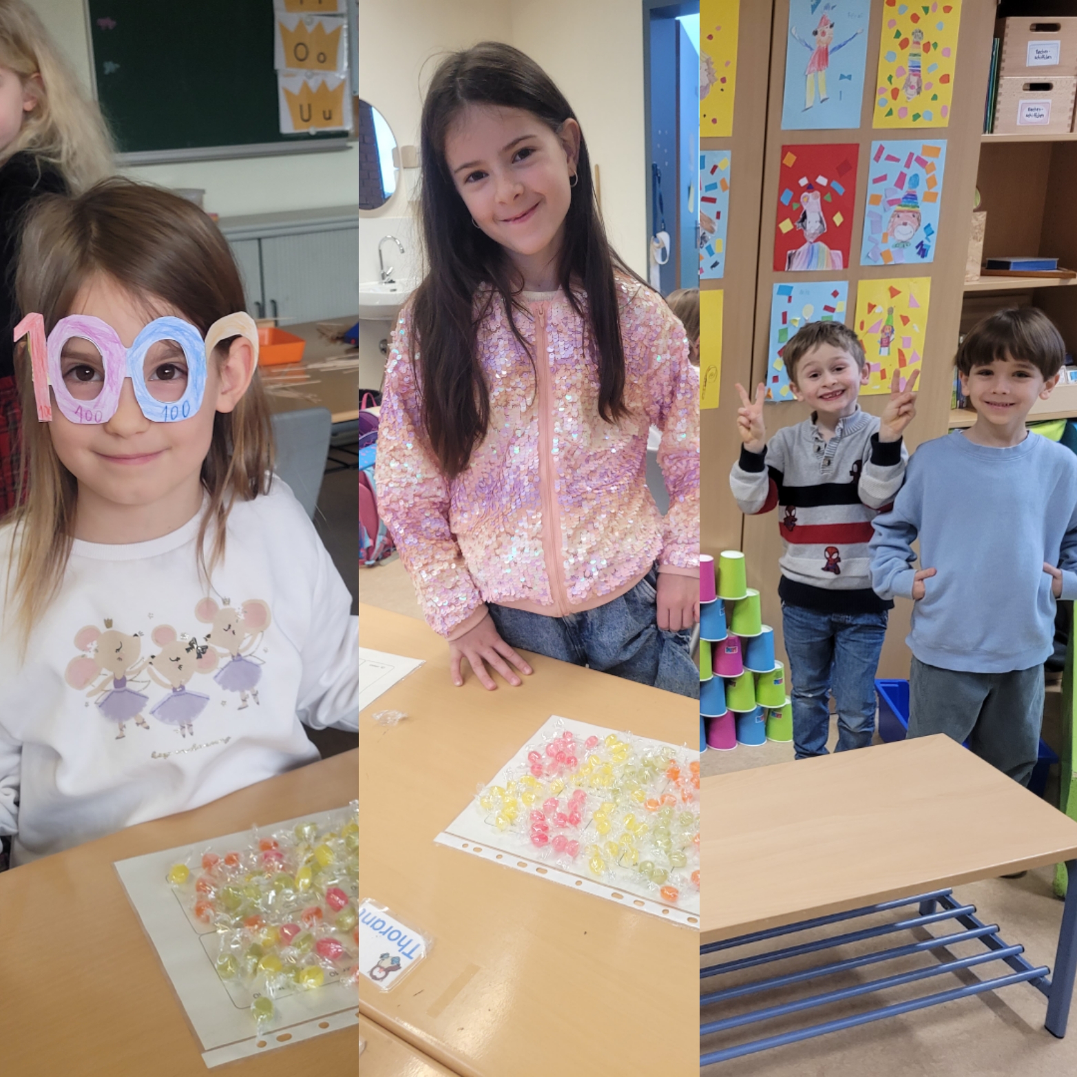 Am Mittwoch, den 25.02.2026 war unsere 100-Tage-Feier. Alle ersten Schuljahre waren in jeder ersten Klasse unterwegs. Es gab in jeder Klasse Stationen. Es gab in der Froschklasse eine Station, an der man Hunderterkronen basteln konnte. In der Eulenklasse konnte man aus hundert Bechern eine Pyramide stapeln. In der Känguruklasse konnte man Hunderterbrillen basteln. In der Erdmännchenklasse konnte man auf ein Blatt 10 mal 10 Steine legen. (Marlene)